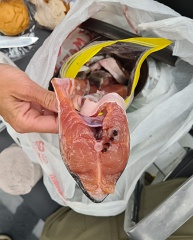 29 августа 2024. В аэропорту Шереметьево по прилёту с Сахалина. Дегустация свежезасоленной красной рыбы в зале получения багажа.