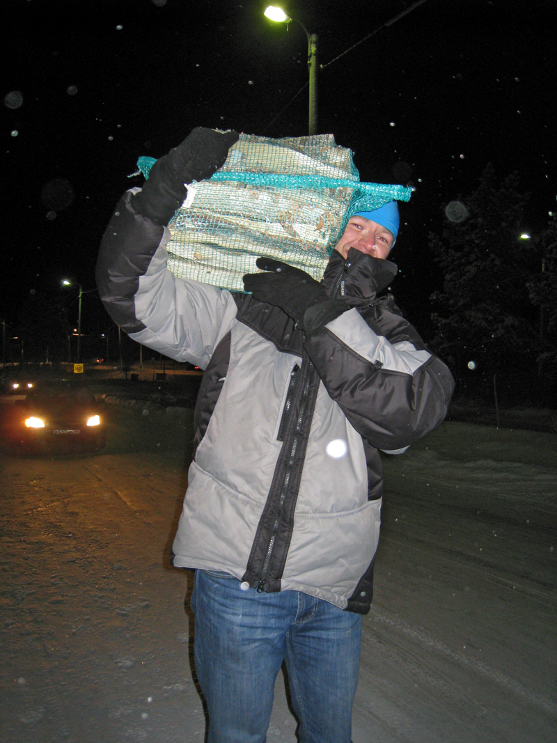 Костя тащит дрова для камина, купленные в супермаркете.