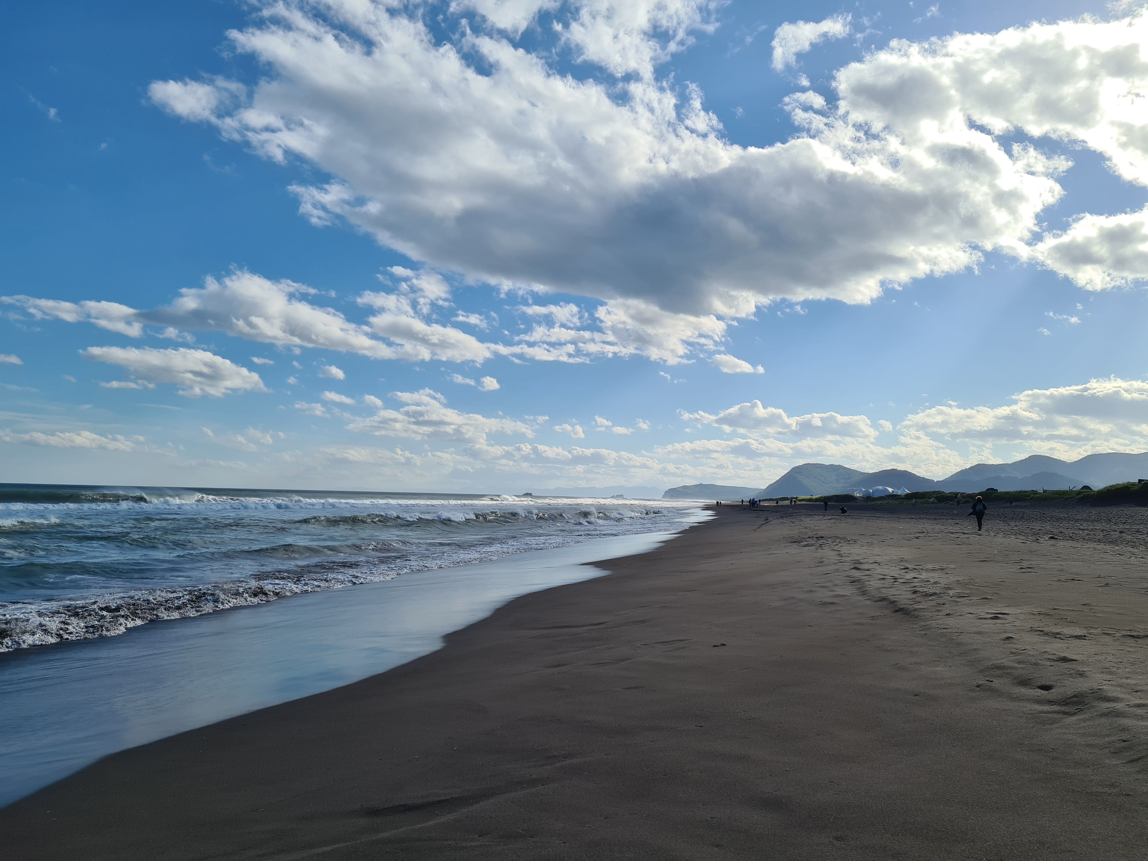 Халактырский пляж с черным вулканическим песком. Берег Авачинского залива.