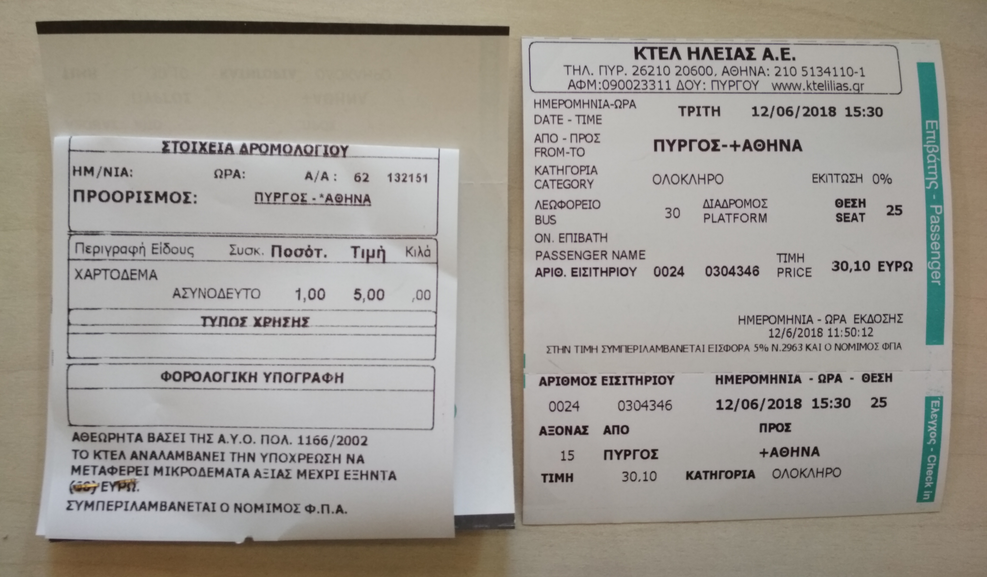 Билет на автобус Пиргос - Афины (справа) и билет на два велосипеда (слева).