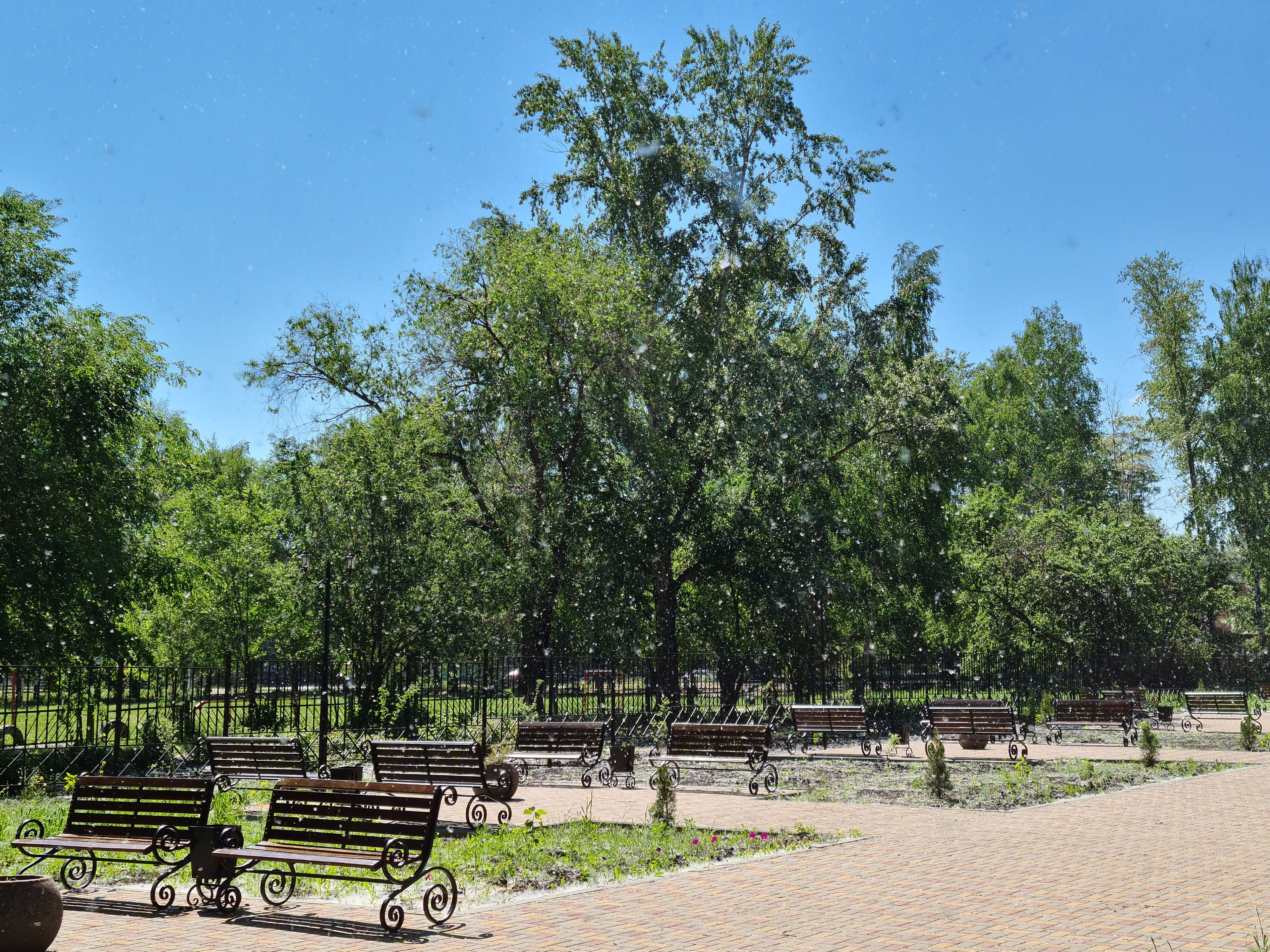 Парк в Строителе. Тополиный пух похож на снег.