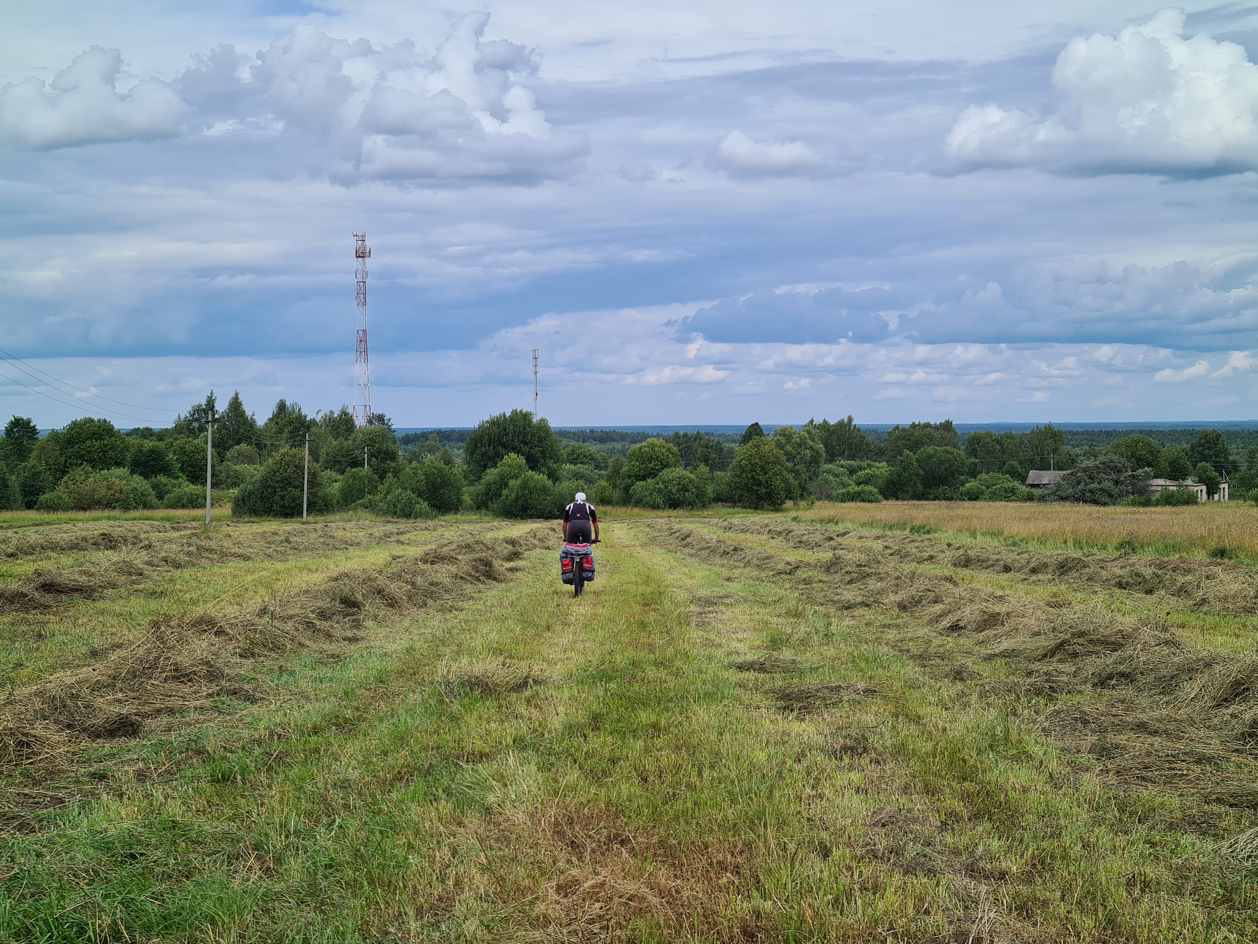 По скошенному полю южнее Ленинской Слободы. Зачем-то решили срезать угол. По дороге было бы быстрее.