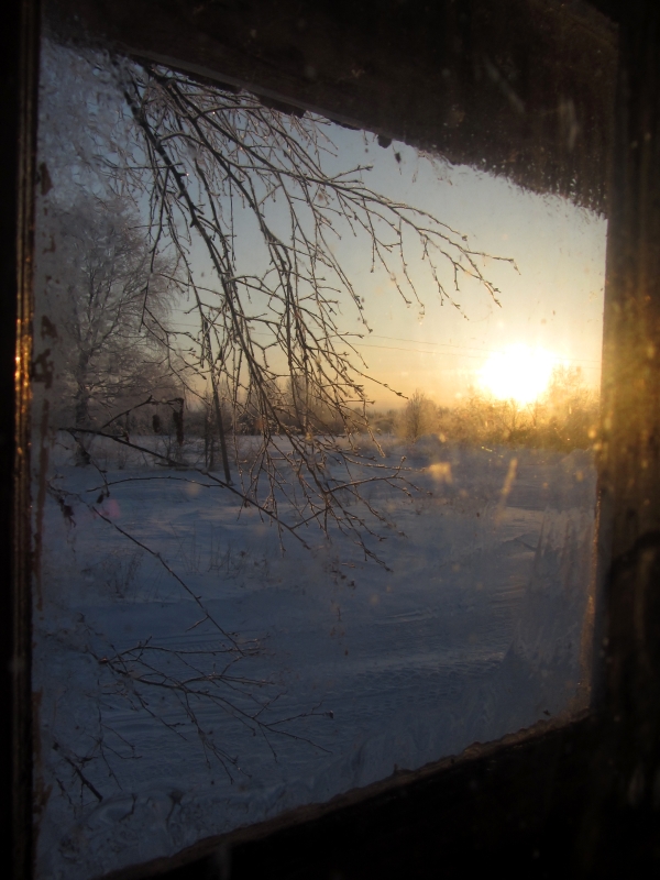 Заиндевелое окно избы.