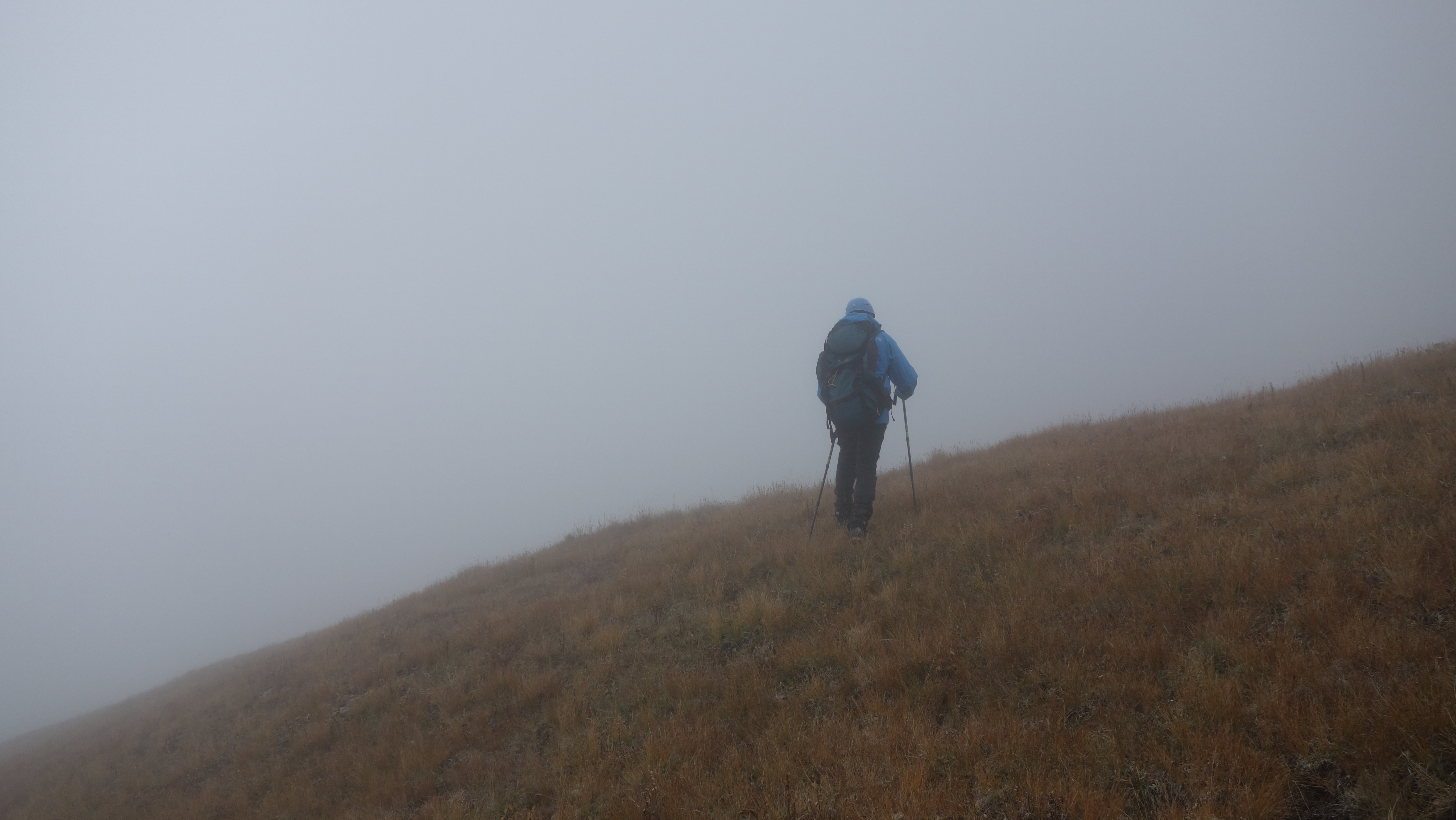 Пришлось вернуться и обходить каньон реки по отрогам, в тумане.