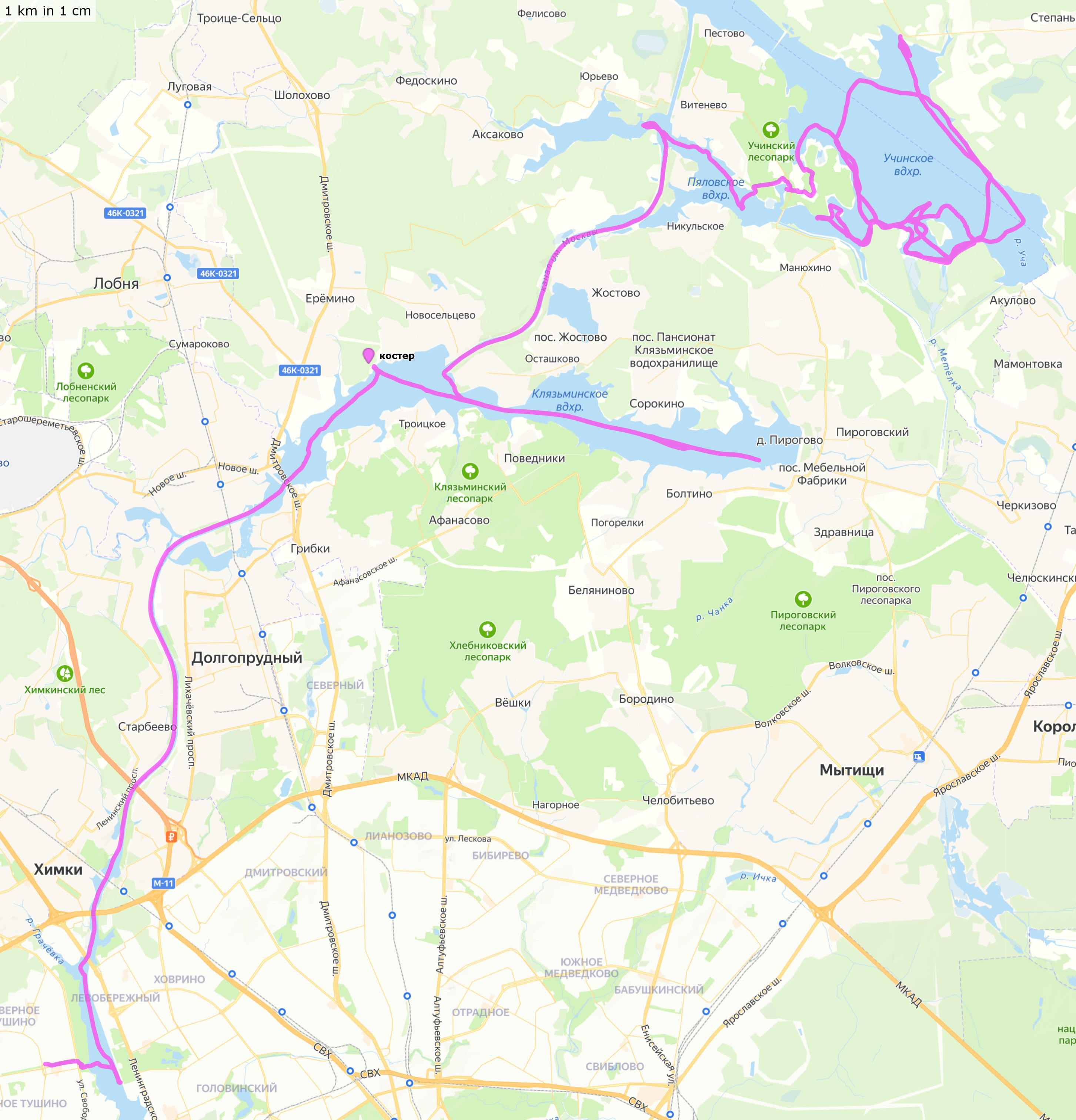 Пять водохранилищ (Учинское, Пяловское, Пироговское, Клязьминское и Химкинское) и канал имени Москвы.