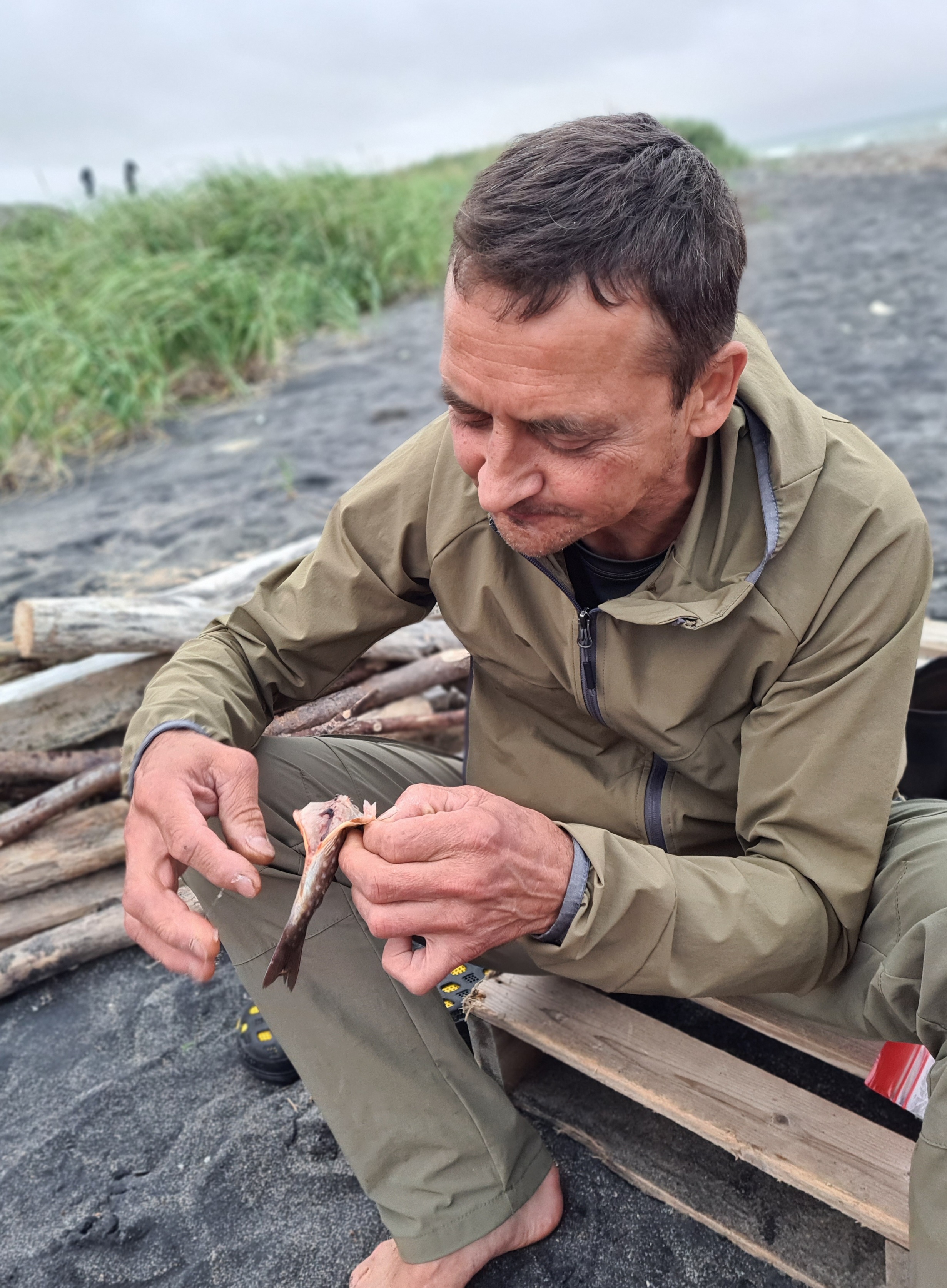 Саша поймал маленькую рыбку.