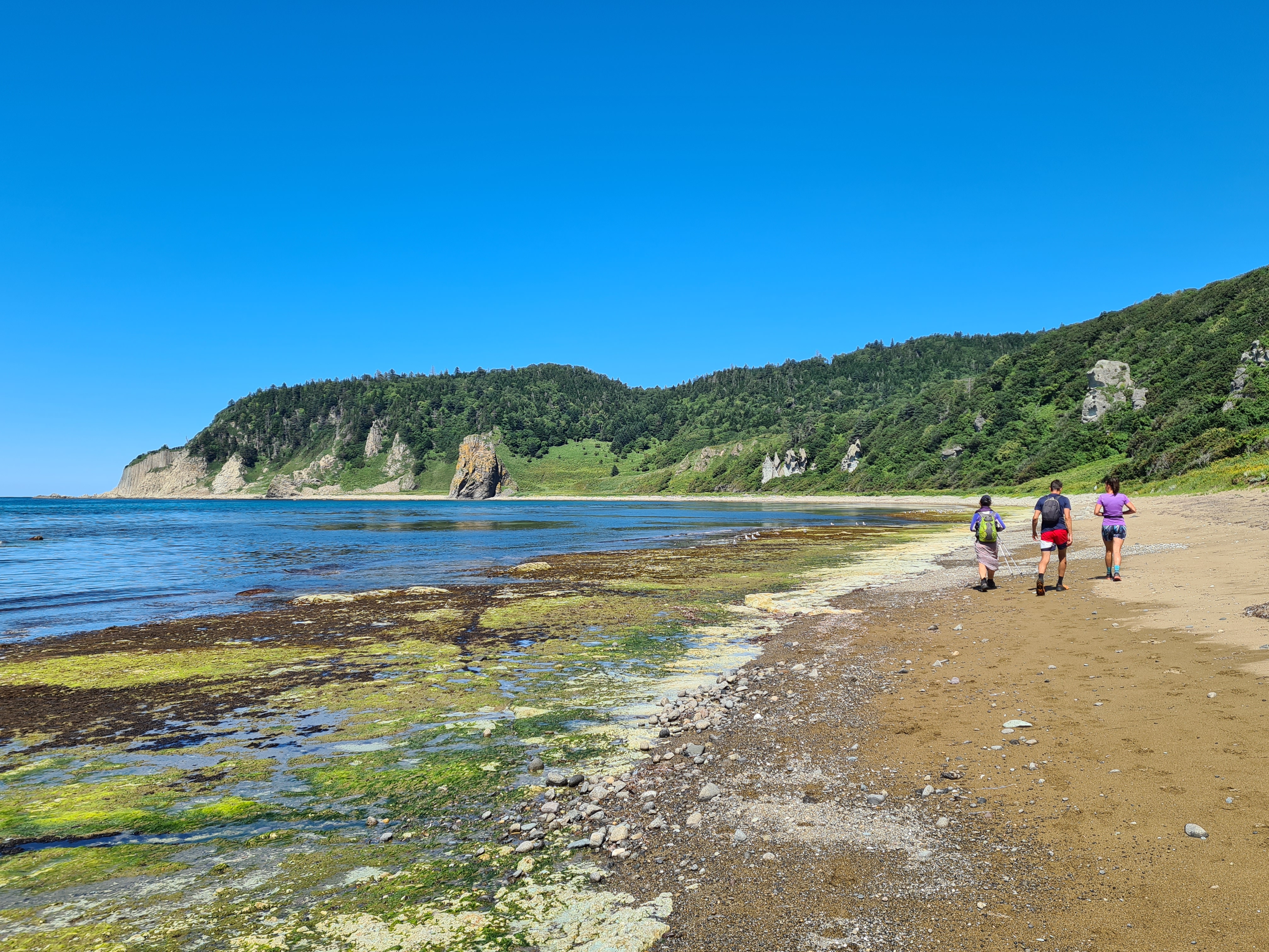 20 августа 2024. Берег Охотского моря в отлив. Радиалка на мыс Столбчатый (он виден вдали).