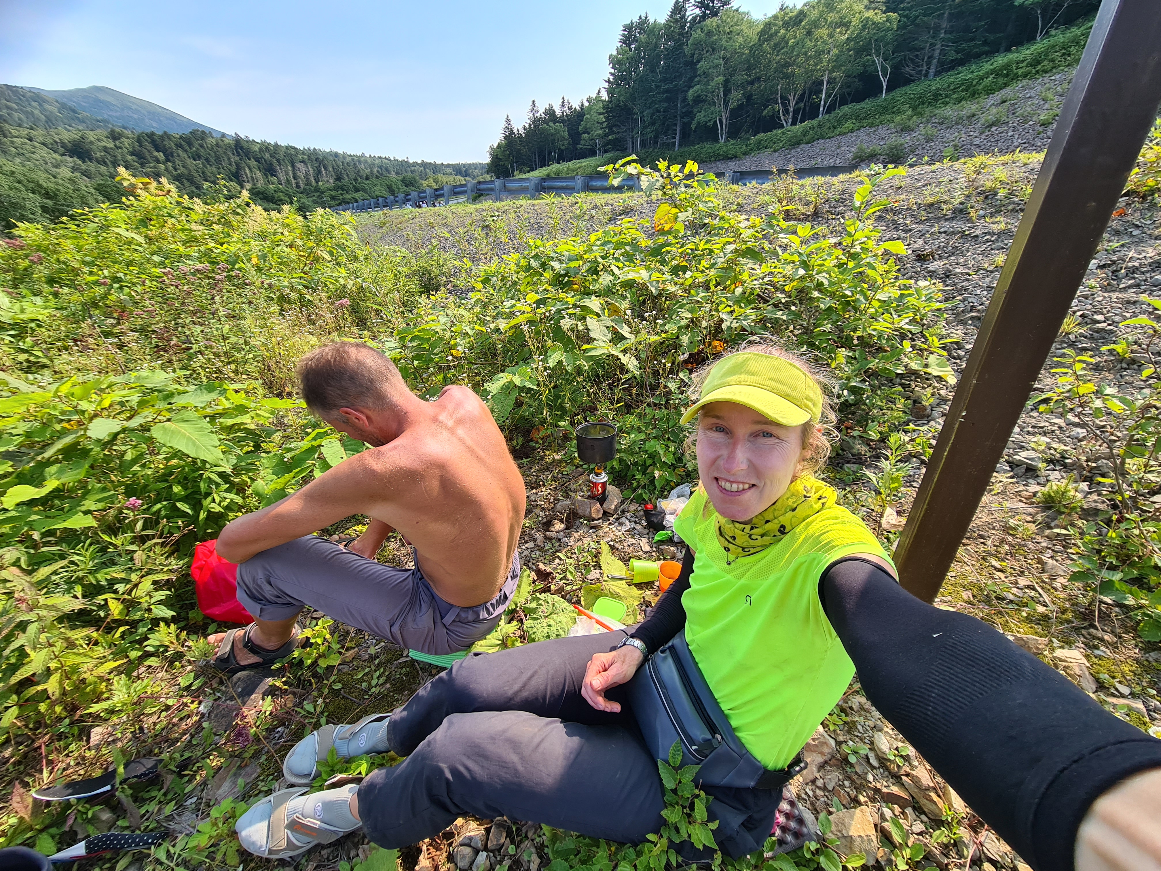21 августа 2024. Ждем машину около шоссе после спуска с вулкана Менделеева.