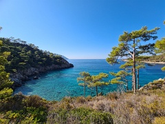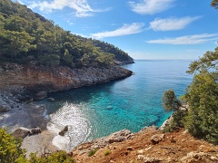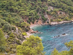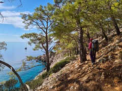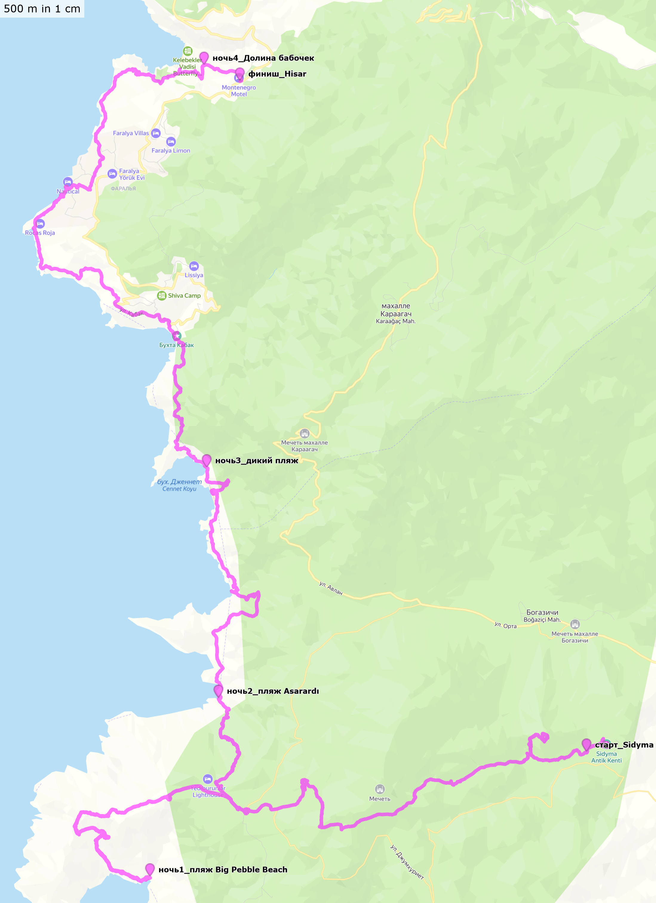 Sidyma (некрополь и акрополь) - Yediburunlar - Big Pebble Beach (ночевка 1) - Asarardi Beach (ночевка 2) - пляж и крепость Kalabantia - Paradise Beach - дикий пляж (ночевка 3) - Kabak - Tektaş Beach - Actas Beach - Faralya - Долина бабочек (ночевка 4) - Hisar, 14+8+5+12+0,7 км