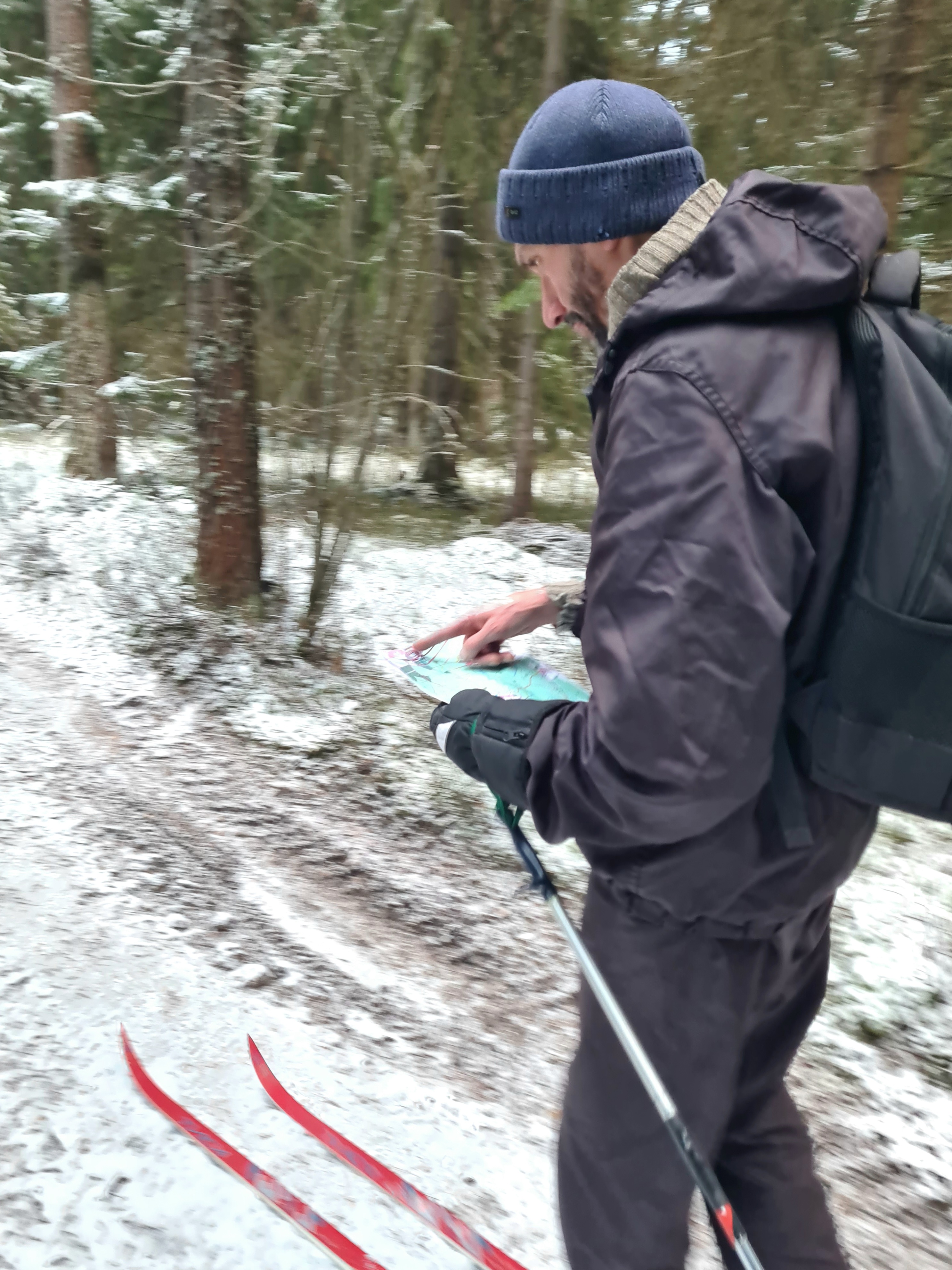 Лёша на лыжах с бумажной картой.