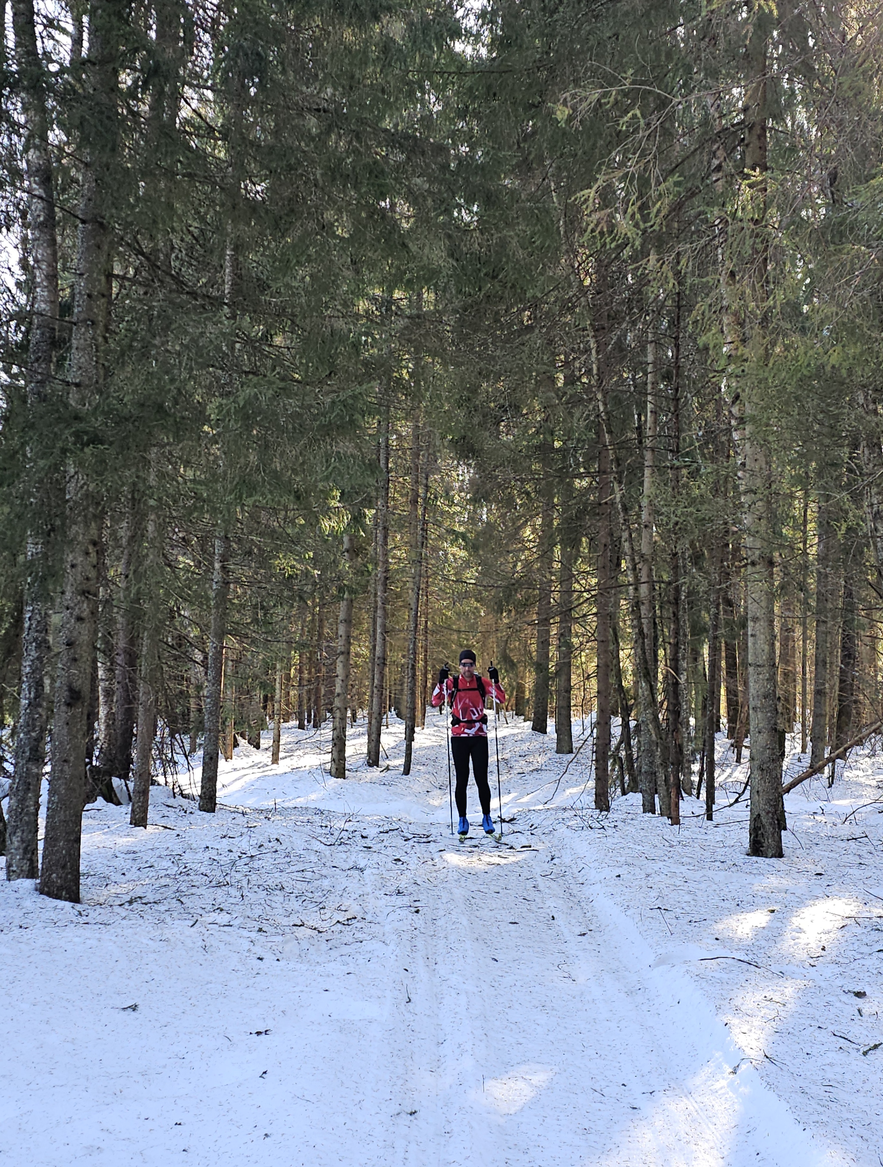 Короткий лесной участок. Всё в опавшей хвое.