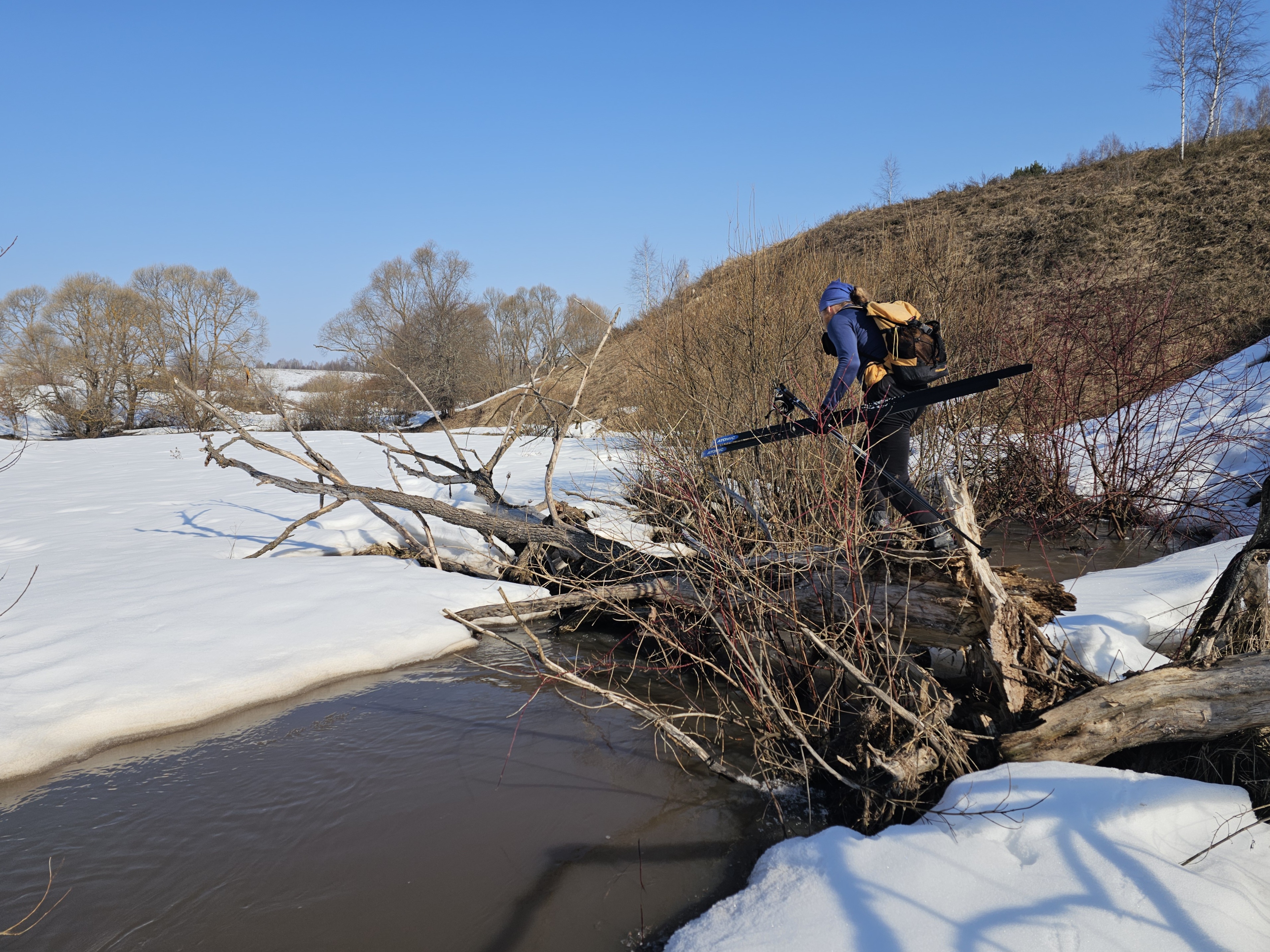 Переходим реку Молтовку по упавшему дереву.