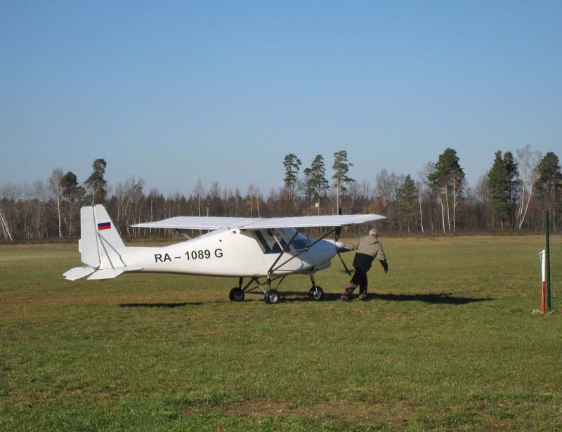 Самолет выкатывают на поле вручную.