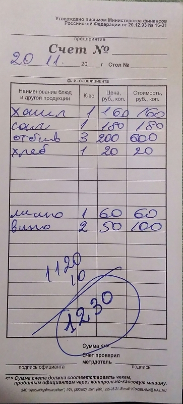 Счет из кафешки на ул.Ардзинба.