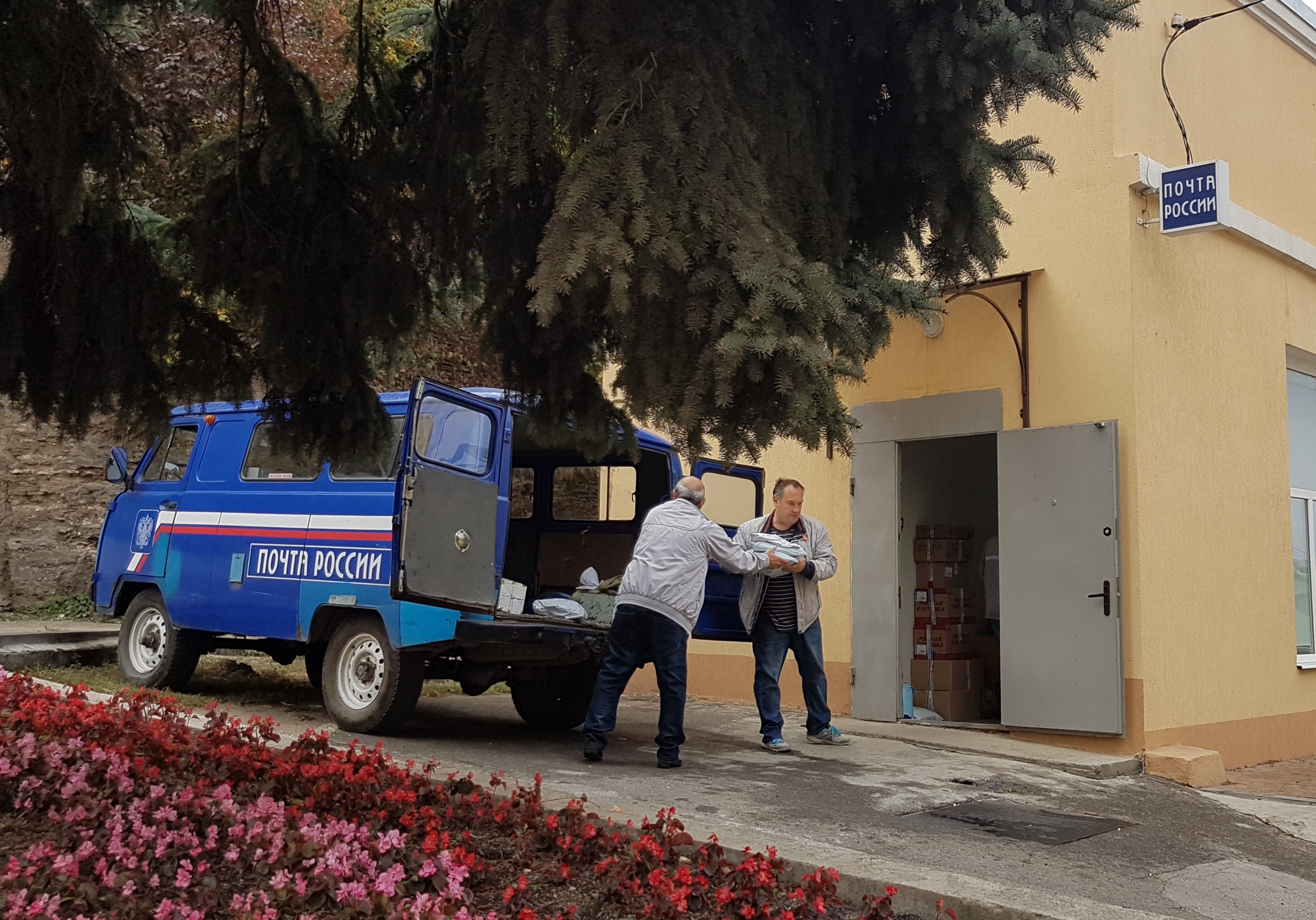 Разгрузка почтовой машины.
