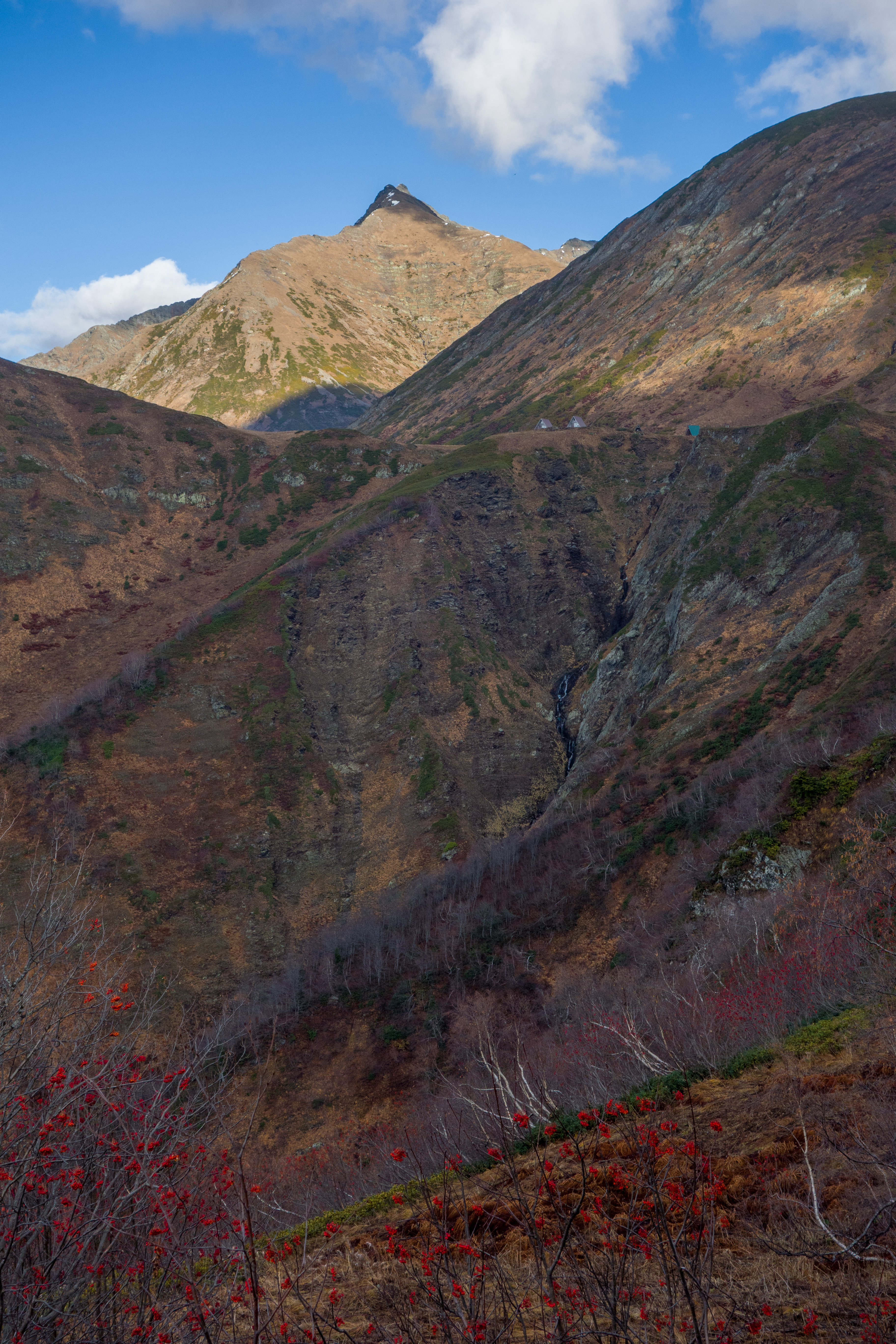 Острый пик на заднем плане - гора Псеашха Сахарная (3189 м). Правее и ниже видны домики-хижины на Бзерпинском карнизе.