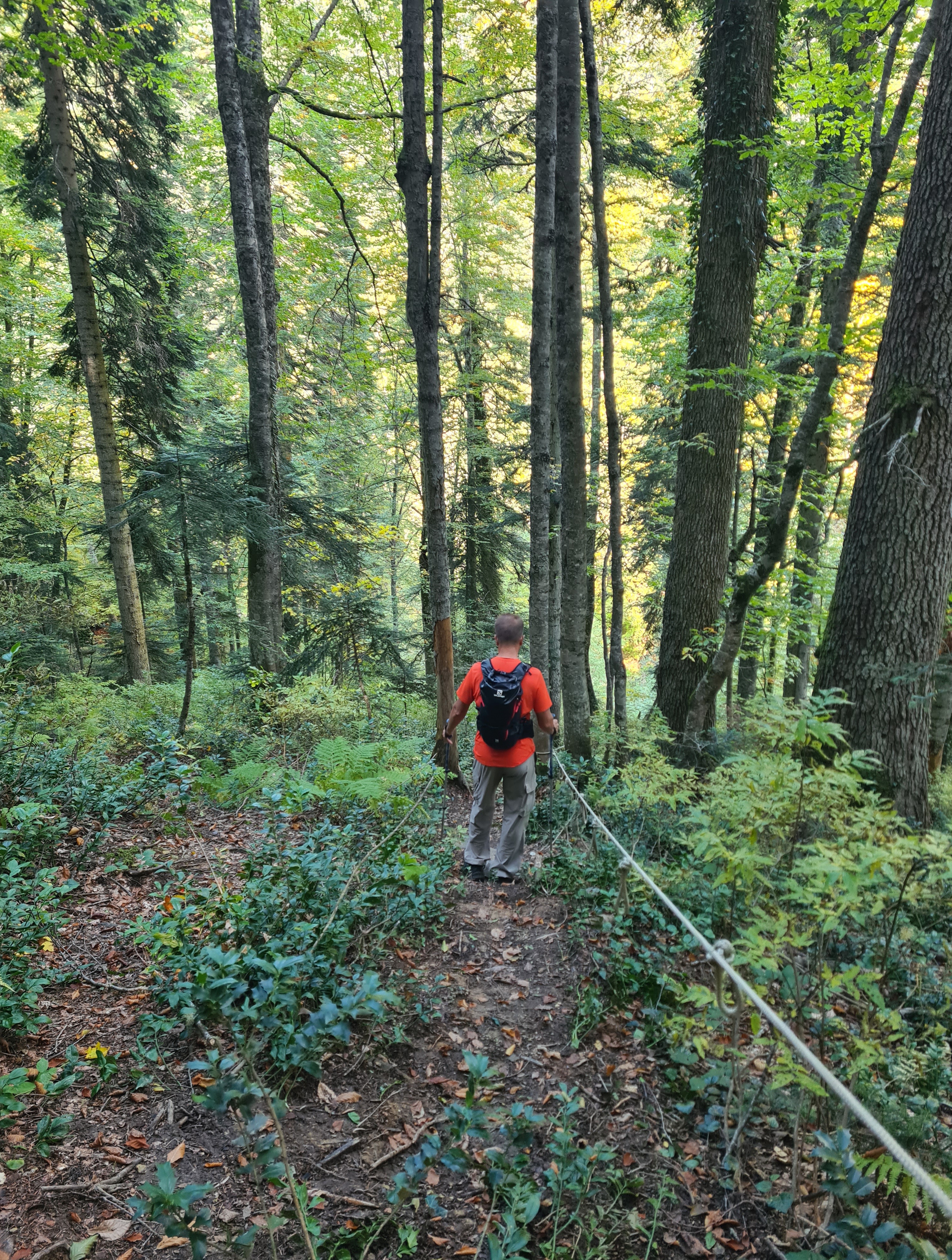 Спуск крутой, натянуты веревочные перила.