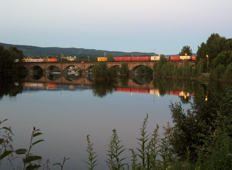 Honefoss, берег реки Begna. На мосту остановился разноцветный товарняк.