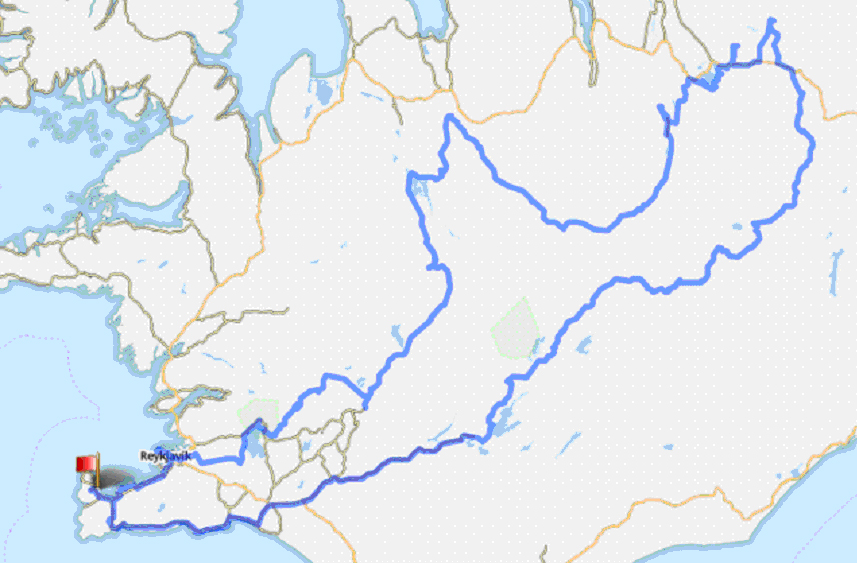 Keflavik (аэропорт) - Reykjavik - оз. Pingvallavatn - нац.парк Thingvellir - Gjabakki - Porolfsfell - водопад Gullfoss - Arbudir - термальная площадка Hveravellir - озеро Blondulon - Hviteyrar - Maelifell - озеро Stafnsvotn - Laugafell - водопад Aldeyjarfoss - Bolstadur - Engidalur - озеро Myvatn (с юго-востока: мыс Skutustadir, дендропарк Hofdi, "Черная крепость" Dimmuborgir, вулкан Hverfjall), Reykjahlid - термальное поле Hverir - вулкан Krafla - водопады Detifoss и Selfoss - Dreki - лавовое плато Odadahraun, вулкан Askja, озера Okjuvatn и Viti - Dreki - ледник Vatnajokull - озеро Porisvatn - Hrauneyjar - Selfoss - Porlakshofn - Strandarkirkja - Grindavik - Blue Lagoon - Keflavik (аэропорт).