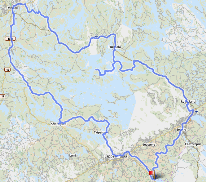 Брусничное (Nuijamaa) - Lappeenranta - Taipalsaari - Savitaipale - ручей в 3 км перед Suomenniemi (1-я ночевка) - Suomenniemi - Ristiina - Mikkeli - Anttola - Puumala - у дороги Luukkolantie в 2 км от Puumala (2-я ночевка) - Nestorinranta (на острове) - Ruokolahti - Imatra - 1,5 км до Vesikkola (3-я ночевка) - Konnunsuo - Брусничное (Nuijamaa).