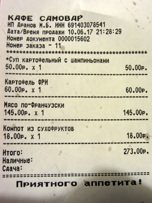 Вечер 10 июня. Зубцов. Чек из кафе "Самовар".
